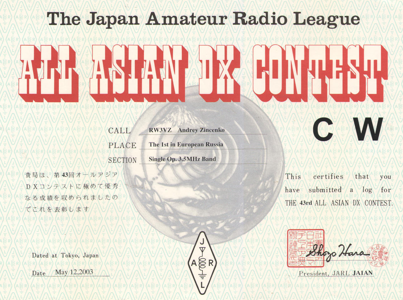 DX-участникам за связи с Азией (кроме американских военных станций, расположенных на Дальнем Востоке, Япония):