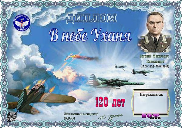 Клуб радиолюбителей-авиаторов «Рыцари неба» с 13 по 21 сентября 2025 г. проводит Дни активности, посвящённые 120-летию Героя Советского Союза, генерал-лейтенанта авиации Е.М.Николаенко и представляет диплом, посвящённый этому событию.